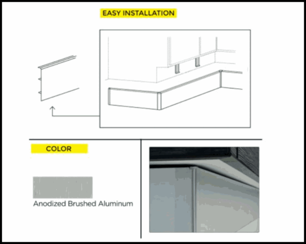 Add a finished look to your cabinetry with a toe kick. This simple strip of Plastic laminated with aluminum is installed below base cabinets and allow you to stand closely to your cabinets and countertops.