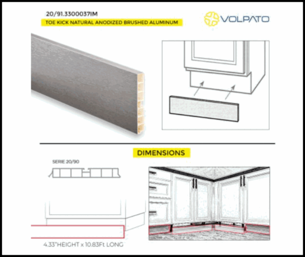 Elevate your cabinetry with Volpato’s premium Italian toe kicks. Measuring 3.93” in height and 10.83 feet in length, these sleek and durable toe kicks add a refined, modern finish while protecting your cabinets from daily wear. Crafted with Italian precision, they bring both style and functionality to your space